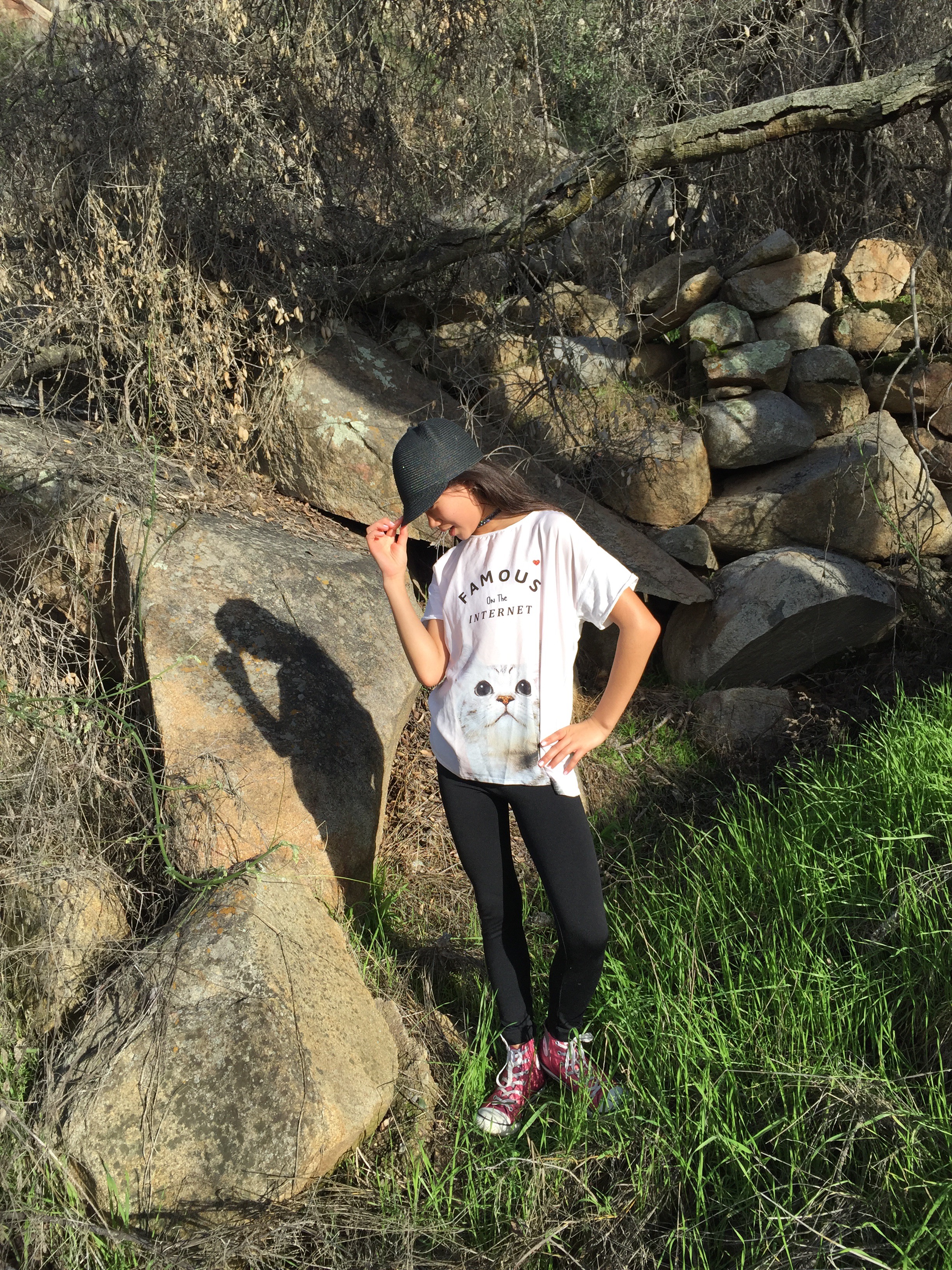 I paired the shirt with a sparkly black choker and with a cat hat that looks great with the cat shirt. Black leggings go well with the outfit and to make this stylish look complete I wore some sparkly pink Converse.