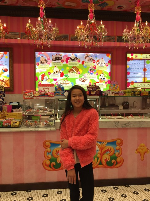 At the Lajolla Westfield mall in California, there’s an ice cream place called Sloan’s ice cream. It has many colors, stuffed animals, and candy. It even has rainbow chandeliers! I loved the place.