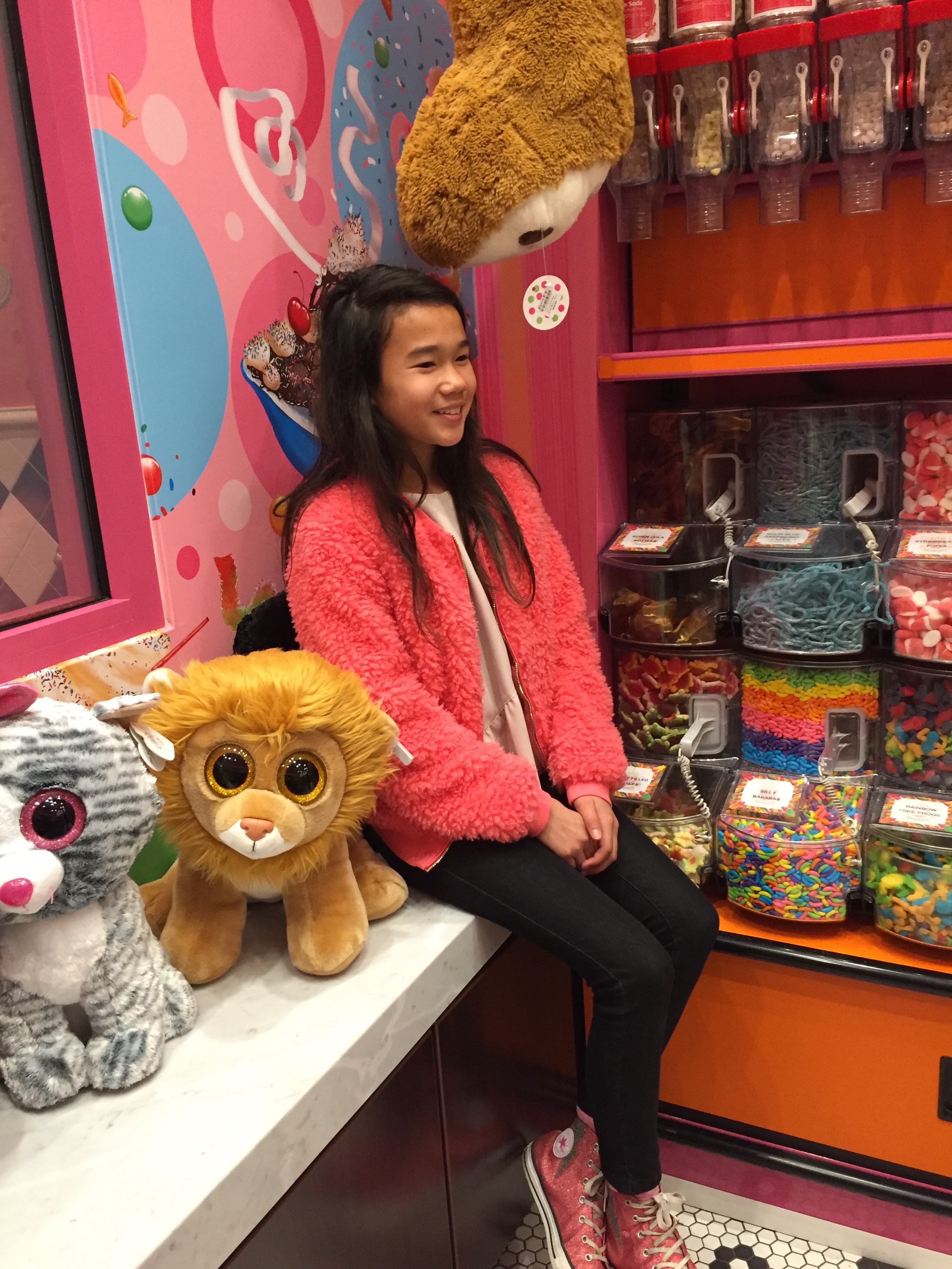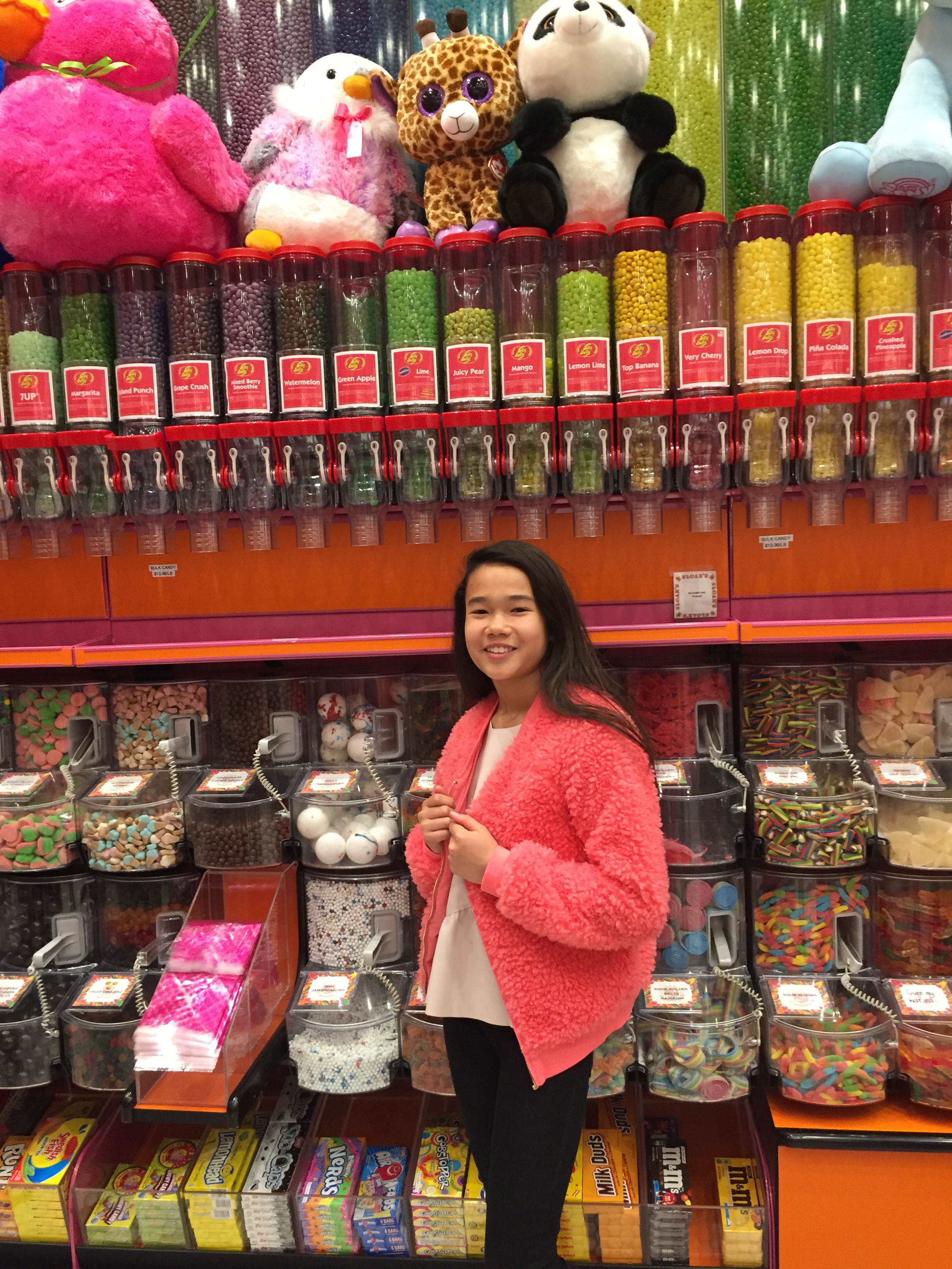 At the Lajolla Westfield mall in California, there’s an ice cream place called Sloan’s ice cream. It has many colors, stuffed animals, and candy. It even has rainbow chandeliers! I loved the place.